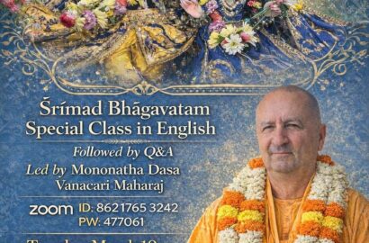 Hare Krishna! We are happy to announce that the Srimad Bhagavatam videoconferences in English will resume with a special session led by His Grace Manonatha Dasa Vanacari on Tuesday, March 10,... Read More