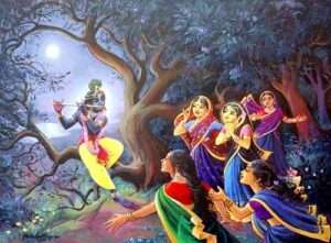 “Anoche, el Señor Krishna, bajo un árbol de ber en el patio de Radharani, silbó como un kokila. Lo hizo durante un largo rato, llamándola insistentemente. Ella comprendió que no era un simple kokila, sino que era Krishna quien la llamaba con el corazón lleno de anhelo. Pero cada vez que intentaba abrir la puerta, sus brazaletes y campanillas resonaban con tanta fuerza, que incluso Krishna podía oírlos. Desde dentro de la casa, la anciana y altiva Jatila gritaba repetidamente: