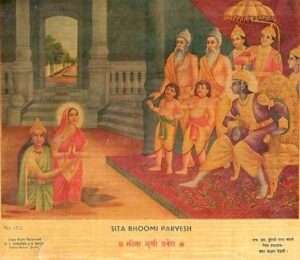 In quel momento il cielo si rischiarò e i Deva apparvero per assistere alla prova di Sita. Subito dopo una lieve brezza profumata si levò e la terra tremò leggermente. All’improvviso vicino Sita si aprì una grossa fenditura e, seduta su uno splendido trono d’oro, apparve la dea Bhumi. Prendendola per mano invitò Sita a sedersi sullo stesso trono e, sorridendo a tutti, sprofondò nel crepaccio, che si richiuse subito dopo. E una pioggia di fiori celestiali piovve dall’alto dei pianeti paradisiaci. E voci diafane cantarono preghiere a Sita e alle sue illimitate qualità spirituali.