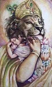 Prahlada Maharaja immediately went to Lord Nrsimhadeva and jumped upon His lap. Nrsimhadeva at once became pacified and tears fell from His eyes. He had been so angry; but now, in a moment, He was fully pacified. He began licking Prahlada Maharaja, as animals do, and said,