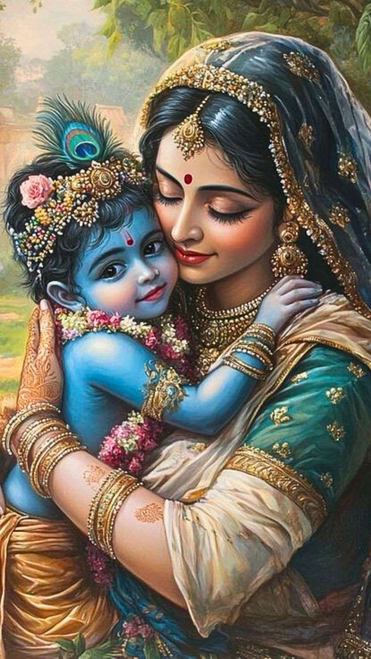 Una vez, Madre Yashoda estaba en el almacén ocupada ordenando algunas faldas, blusas, chales y otras prendas y adornos caros para ponerlos en un gran cofre. En ese momento, el travieso Krishna irrumpió en la habitación. Se acercó a ella por detrás, le puso los brazos alrededor del cuello e insistió en saber lo que estaba haciendo.