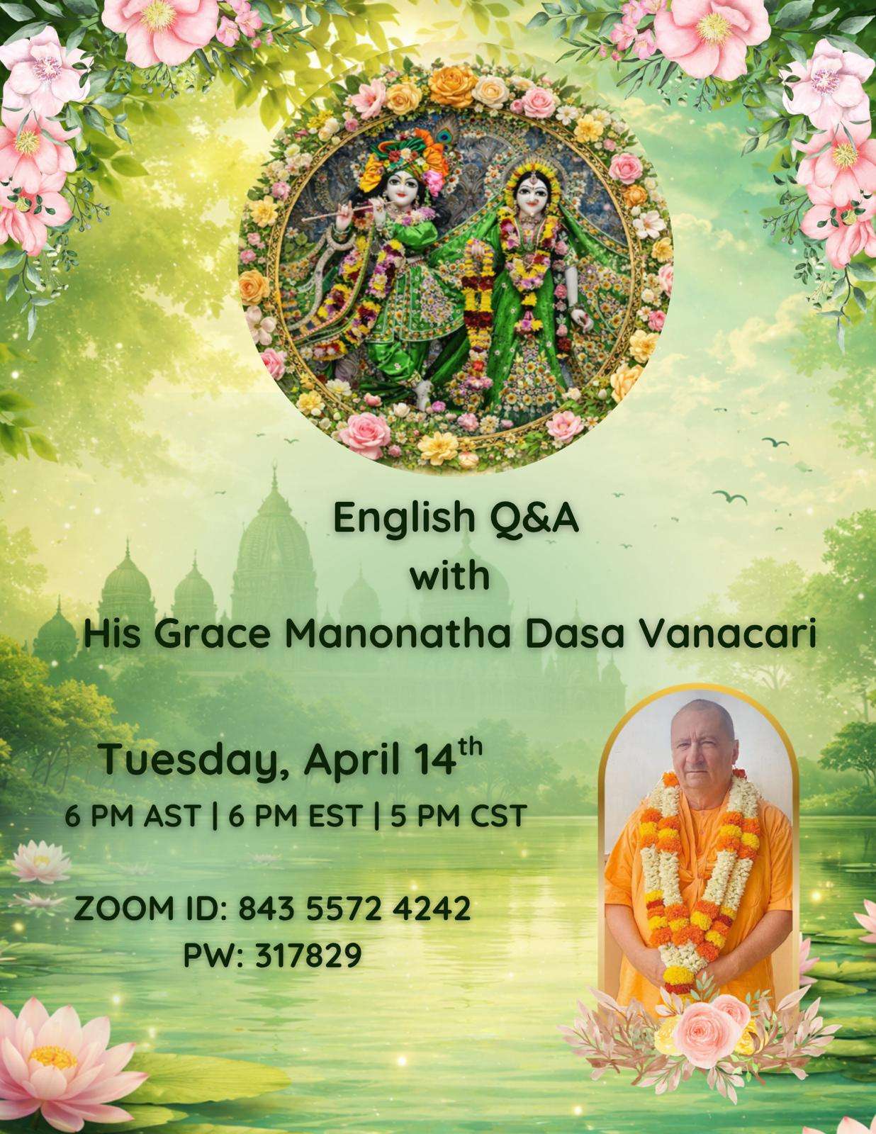 Hare Krishna, disciples and friends of Manonatha Maharaja. Please join us on Tuesday, April 14, 2026 for a Zoom videoconference of Questions and Answers in English with His Grace Manonatha Dasa Vanacari.