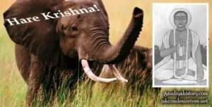 “Este no es un humano común. Debe ser una expansión de Narayana. Todo lo que me dijo se basa en las Escrituras. Por la gracia de Rasika, el elefante alcanzó el conocimiento completo y aceptó al Señor Krsna como la única verdad. Cayó a los pies de loto de Rasika y los lavó con sus lágrimas. Colocando una mano sobre la cabeza del elefante, Rasika pronunció el mantra Hare Krsna de dieciséis palabras en su oído derecho.