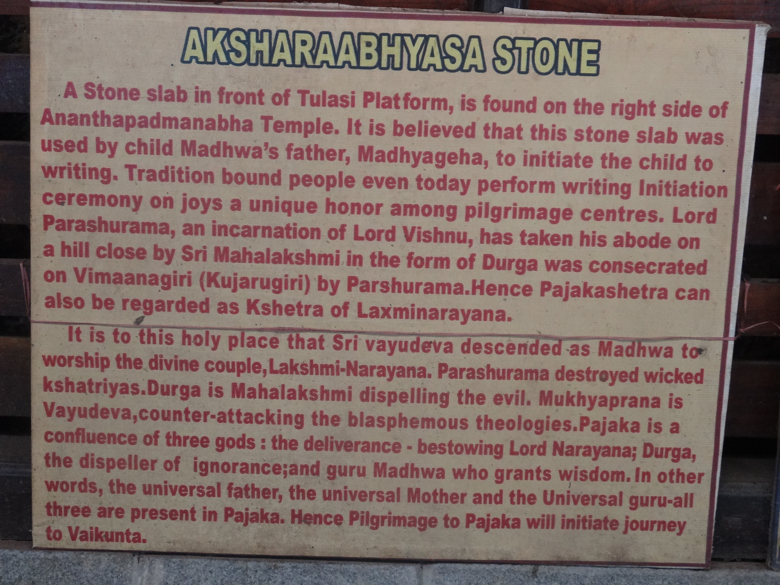 A stone slab in front of Tulasi platform is found on the right side of Anantha Padmanabha Temple. This stone slab was used by Madhva’s father, Madhyageha to initiate the child to writing. Tradition bound people even today perform writing initiation ceremony.