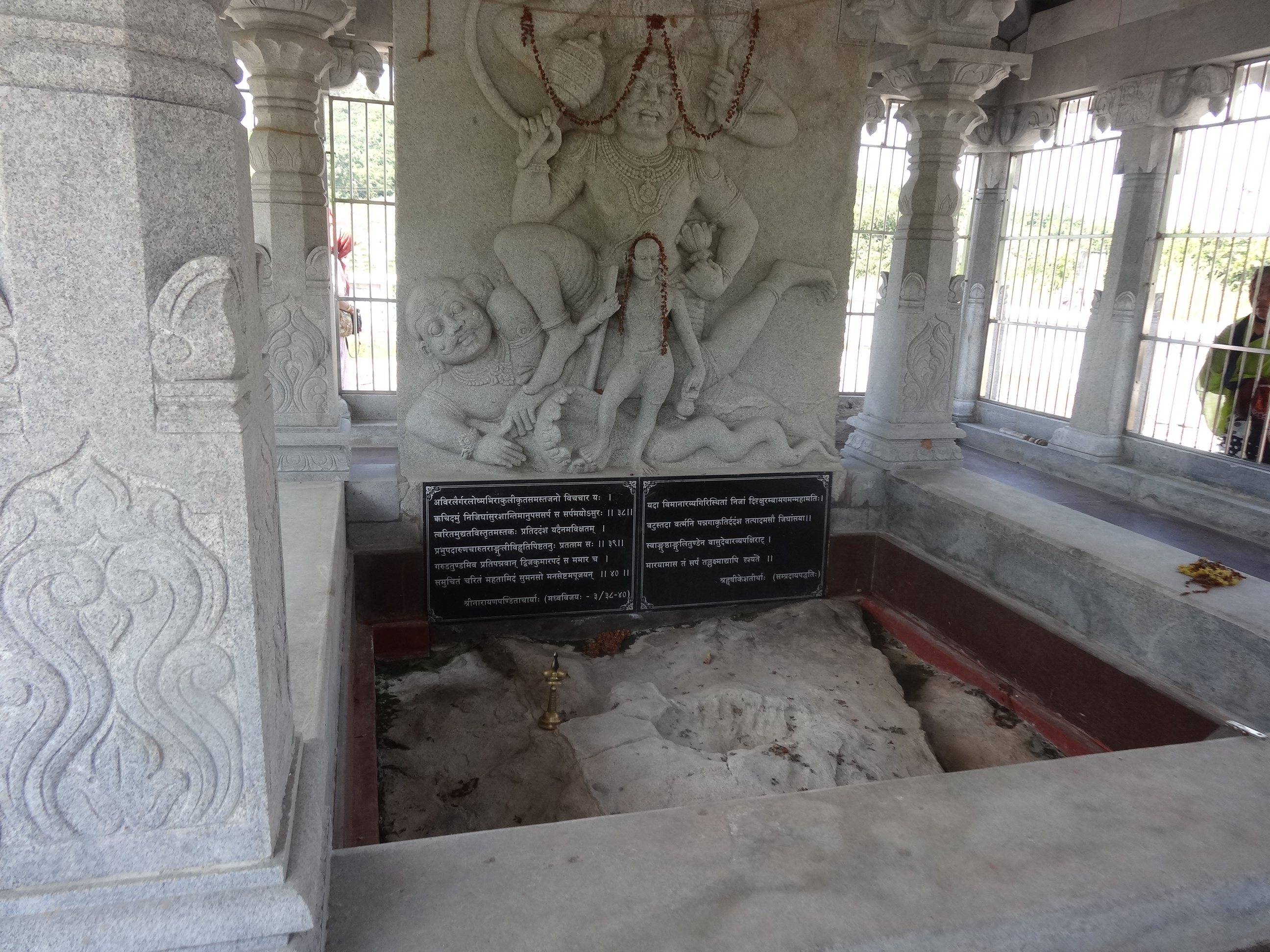 Killing of Maneman: Once, close-by at a place called Vimangiri, little Vasudeva was playing. The demon Maneman took the form of enormous poisonous snake, and he launched to bite and devour the little boy Vasudeva. Vasudeva, with one toe, crushed his head. While he was doing this, he was late for lunch, so his mother called him. She was really worried; he was a distance away. So, to not worry his mother, with one jump he went all the way from this rock to his home. Madhvacarya’s footprint is still there along with the print of Maneman.