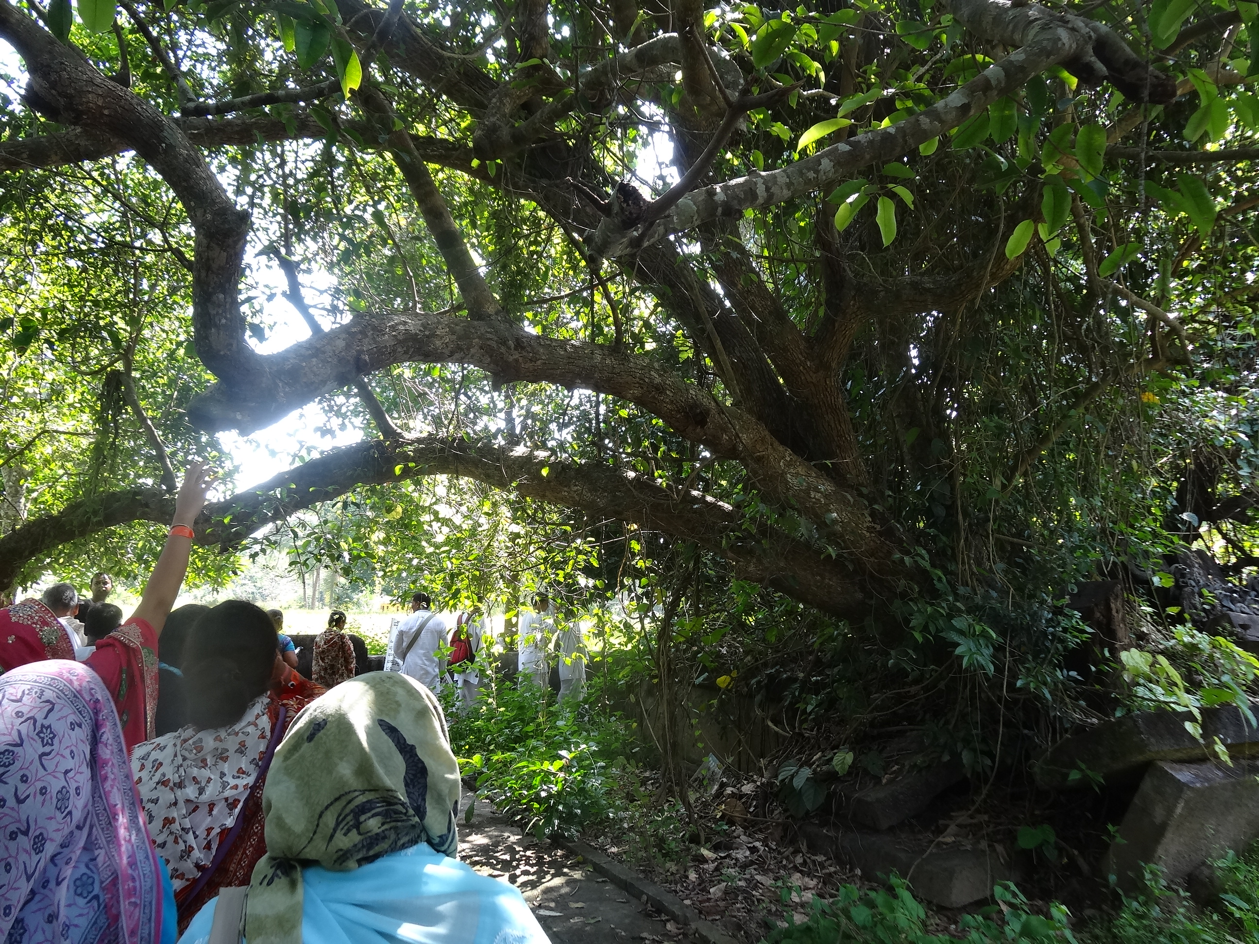 So Vasudeva came home after playing and saw this man sitting on his doorstep. He said, “Why are you here?” The man didn’t answer. Then, he asked his father, and said, “Father, it’s already beyond time for taking Prasad. Why are you not taking Prasad? Let’s go and take Prasad.” Father said, “I cannot take Prasad.” Vasudeva understood. He came to the man at the door and he said, “You please come with me.” He was so beautiful, so charming. No one could refuse him. So just over here is a tamarind tree which has immortal history. He brought him to this tamarind tree and Vasudeva filled his own hands with tamarind seeds and offered them as a gift. The man opened his hands and Vasudeva filled his hands with these tamarind seeds. He looked in his hands, and each tamarind seed turned into gold coins, exactly the amount of the debt and more. So, this man came to Madhvacarya’s father and told him, “Your debt is paid. Thank you very much.” And then they took nice Prasad together.