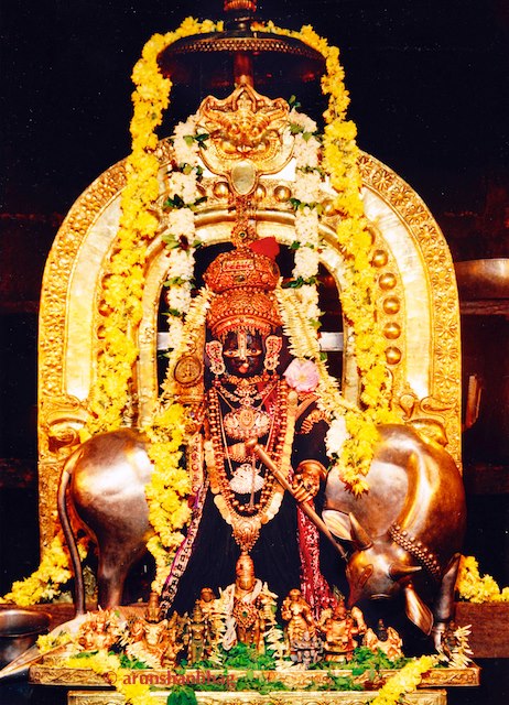 Before Madhvacarya’s departure from this world, he appointed eight of his sannayasi disciples in-charge of the worship at Sri Krishna Matha and propagate Krishna consciousness. Today the responsibility for the worship is rotated in two-year periods called Paryaaya among eight sannayasis in disciplic succession from the original eight. During the fourteen-year interim period between turns at paryaaya, each sannayasi travels and preaches and raises funds for use when his turn for worship comes. Each sannayasi also heads his own Matha, where other deities, ones given by Madhvacarya to the original eight sannayasis, are worshipped. These eight Mathas are located along Car Street, a road that circles the Candramauleshvara and Ananteshvara temples and runs right past the main entrance to Sri Krishna Matha.