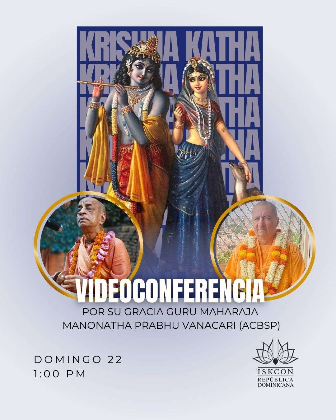 El 22 de marzo se llevará a cabo una videoconferencia con Su Gracia Guru Maharaja Manonatha Prabhu Vanacari (ACBSP). Sera a la 1:00 pm, hora de Puerto Rico/República Dominicana.